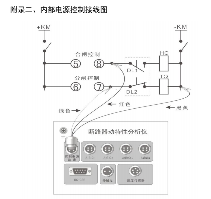 ①分合閘控制電源由儀器內(nèi)部提供時,斷開被測開關(guān)控制箱內(nèi)的控制電源(通常是將控制箱內(nèi)控制電源與控制母線相連的保險撥掉),但不能切斷開關(guān)機構(gòu)的儲能電源,然后再按附錄二《內(nèi)部電源控制接線圖》接線。