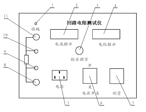 1—接地      2—電流顯示(A)    3—電流調節     4—電阻顯示(μΩ)   5—測量開關    6—電源開關     7—電源插座      8—電流輸出“-”9—測量輸入“-”    10—測量輸入“+”    11—電流輸出“+”