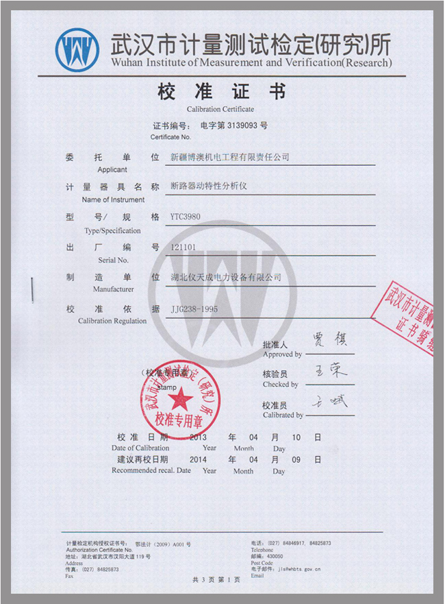 轉載:"YTC3980斷路器動特性分析儀鑒定證書" 請注明來源于儀天成電力。 更多技術問題請致電儀天成電力客戶服務:027-87876585,技術部專線:027-87876585,在線客服:719388481